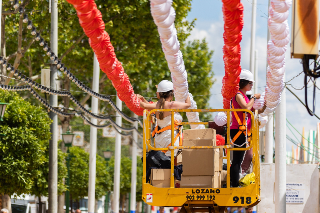 En el montaje del real (portada, casetas, farolillos y luces, atracciones) se suelen ver una mayoría de hombres hasta el punto de pensar que es trabajo exclusivo de ellos porque son profesiones muy masculinizadas en las que las mujeres no consiguen hacerse un hueco.