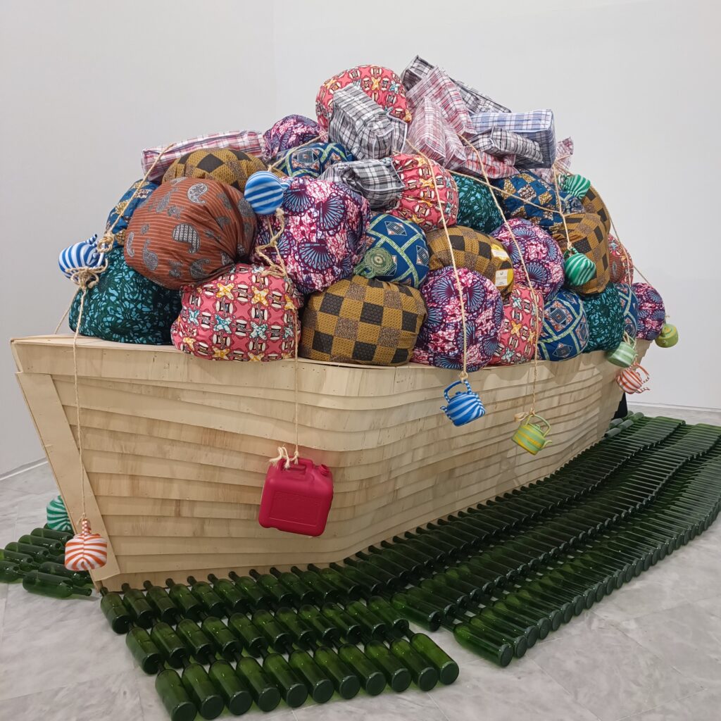 En la historia de la Amefricanidad están muy presentes las travesías forzadas o voluntarias de personas que van desde el tráfico de esclavos hasta las migraciones contemporáneas. Toguo, inspirándose en la crisis migratoria de 2010, nos muestra este barco de madera que evoca las precarias condiciones en que se realizan estas peligrosas travesías.