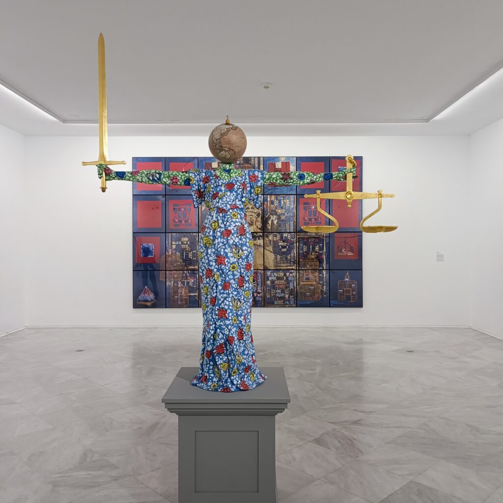 La artista investiga las contradicciones de los sistemas legales construidos históricamente de forma excluyente. Las telas utilizadas son un elemento central del lenguaje artístico de la autora por su vinculación, a lo largo de los siglos, a las rutas comerciales coloniales.