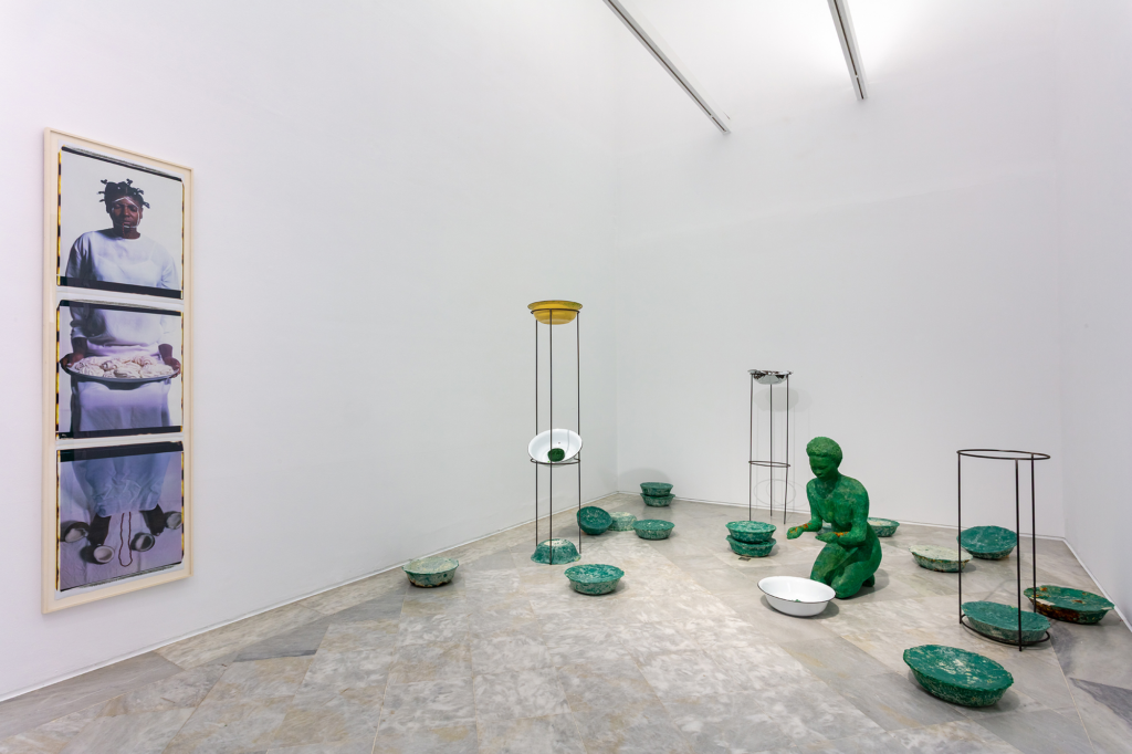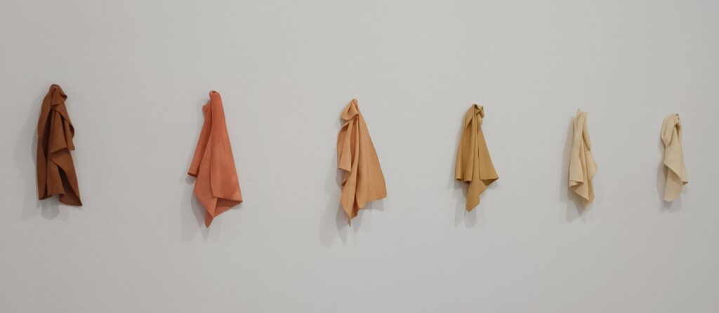 Los trapos de cocina que expone esta artista multidisciplinar, que trabaja la fotografía, las instalaciones, el vídeo y la escultura, tienen un aspecto tan cotidiano y tan doméstico que no parecen hechos de cerámica. Muchas de sus obras se centran en la cultura material y el trabajo femenino en la casa, pero están siempre impregnados de impactantes rasgos de “racialización”. En esta instalación de trapos cerámicos, Juana Valdés trabaja con porcelana “bona” china, un material muy valorado por su blancura y asociado a la valiosísima cerámica europea. La autora le añade pigmentos de diferentes tonos de piel morena, criticando así el ideal de blancura como valor primordial y reivindicado elegantemente el mestizaje.