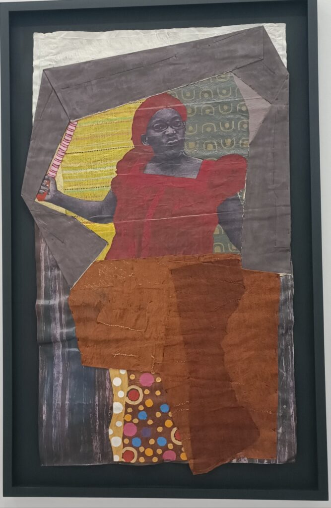 La doctora Stella Nyanzi, académica y activista ugandesa que desafió en su país la opresión institucional sobre las mujeres, es aquí homenajeada en una imagen realizada en tela y plástico. En la obra, la mujer empuña la espada mostrando su resistencia política y feminista. Pero sus ropas hacen referencias a prácticas ancestrales, pues la tela de corteza se vincula a rituales y a modos de producción artesanales, quedando así entrelazadas la tradición y las narrativas actuales.