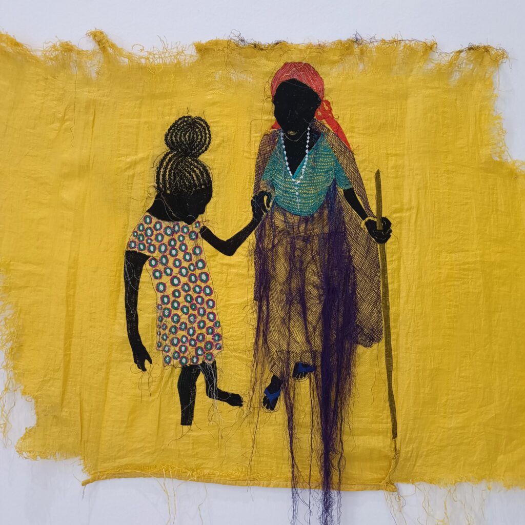 Este precioso cuadro realizado con materiales naturales y bordado a mano, transmite tanta ternura entre abuela y nieta que se puede mirar sin cansarse durante un buen rato. Es una obra colorida y poderosa. En ella tiene cabida la memoria, la migración, la herencia familiar, las experiencias intergeneracionales en el ámbito doméstico, la preservación de los conocimientos, el respeto y el cariño.