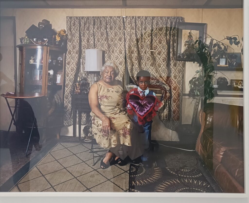 Al lado de la anterior encontramos otra obra de ambiente intimista y doméstico. Lawson es una gran artista y fotógrafa del retrato negro. En esta imagen la figura infantil, al lado de su abuela, asume un valor simbólico al portar en sus manos un vínculo, los anillos, que representan transmisión y continuidad, familia, parentesco, responsabilidades heredadas, en suma, la afirmación de la vida negra en toda su complejidad familiar y cotidiana.