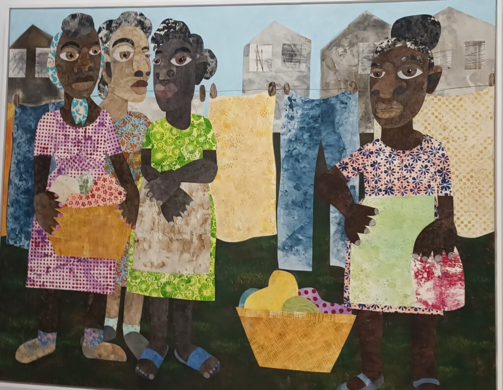 Partiendo de un recuerdo de su infancia en el sur de Texas, Tenzeno enfoca el tendedero como un espacio de convivencia comunitaria de las mujeres, que, mientras se secaba la ropa, intercambiaban historias, conocimientos y cuidados. Es una forma de abordar lo doméstico y la herencia cultural afroamericana a través de un trabajo muy elaborado de técnicas de grabado, estarcido y pintura.