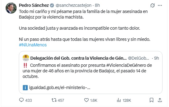 La confirmación de este nuevo crimen machista ha causado de nuevo repulsa tanto a nivel nacional como autonómico. El presidente del Gobierno, Pedro Sánchez, ha condenado el asesinato con un mensaje publicado en la red social X, en el que reafirma el compromiso del Gobierno en la lucha contra la violencia machista. “Una sociedad justa y avanzada es incompatible con tanto dolor. Ni un paso atrás hasta que todas las mujeres vivan libres y sin miedo. Ni una menos”.