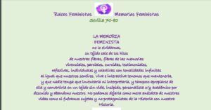 RAÍCES FEMINISTAS MEMORIAS FEMINISTAS Por Mireya Forel Sevilla 70-80LA MEMORIA FEMINISTA no lo olvidamos, su tejido sale de los hilos de nuestras fibras, fibras de las memorias vivenciales, parciales, zurcidas, testimoniales, reflexivas, individuales y colectivas con tonalidades infinitas al igual que nuestros sentires. Viva e interactiva tenemos que mantenerla, y que nadie tenga que inventarla … Sigue leyendo NOTAS REBELDES