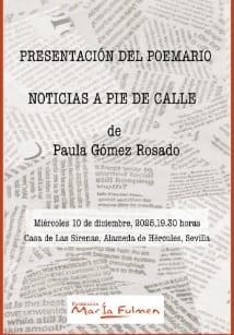 La nueva obra que publica la Editorial Fulmen es un poemario de la escritora sevillana, Paula Gómez Rosado. Un libro de setenta y dos poemas que atesoran la dedicación tenaz, perseverante, casi enfermiza de una mujer que escribe a diario y que cada semana, desde hace años, cuelga en su muro de Facebook un nuevo verso con el que obsequiar a las numerosas personas que fielmente la siguen. Un envoltorio literario, el 6º de su colección, titulado “Noticias a pie de calle”, que Paula Gómez Rosado nos ofrece como la nueva prueba de vida de una existencia en perpetua creatividad: vive porque escribe y escribe porque vive y si no escribiera no sería ella.