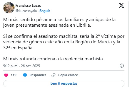 También el delegado del Gobierno en la Región de Murcia, Francisco Lucas ha dado el pésame a familiares de la víctima a través de la red X. De confirmarse el asesinato como de violencia de género, sería la segunda víctima en la comunidad murciana en lo que va de año. También la 34 en todo el país y la 1.329 desde 2003.