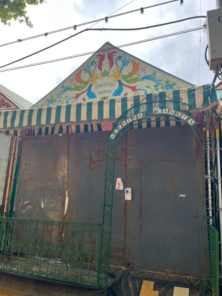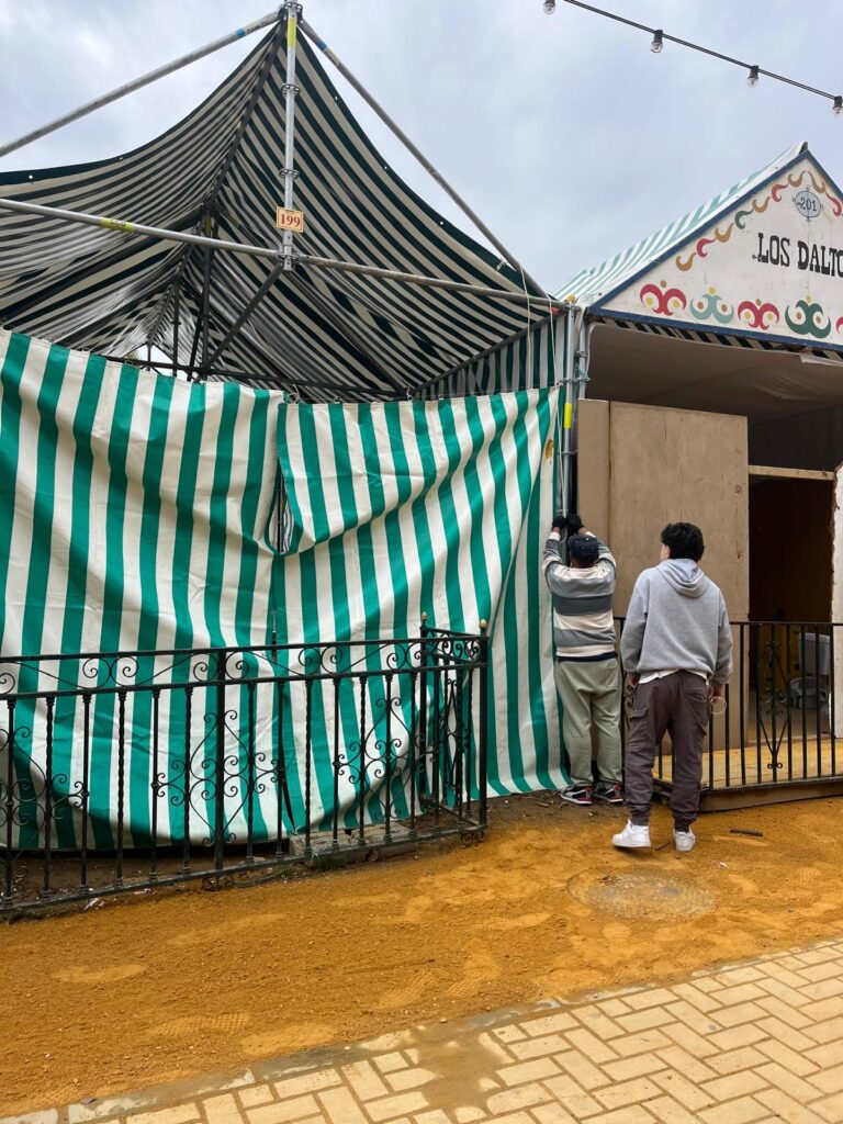 – “Yo me encargo de muchas cosas: pintura, decoración… lo que haga falta. Hay mucho que hacer, colgar las telas, los espejos, adornos…todo. El tiempo que tardamos en ponerlo todo a punto depende del tamaño de la caseta. Pero claro, a veces estoy liada en una caseta y me llaman para que vaya a ayudar en otra, o tengo que salir porque hace falta una escalera o cualquier otra cosa”, declara.