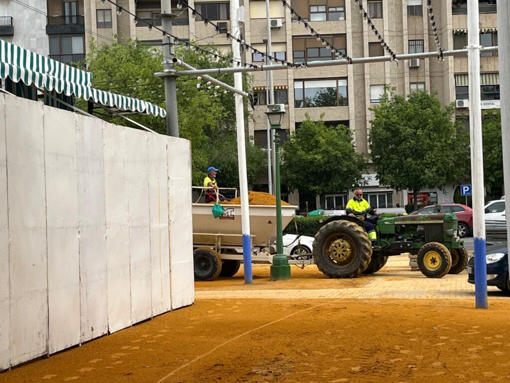 En nuestro paseo vemos cómo las luces que dan magia a la noche en el Real son colgadas en los altos postes, a los cuales hay que acceder a través de una grúa. Varios tractores trabajan a destajo echando el característico albero que identifica el recinto enmarcando las calles adoquinadas por las que circularán cientos de coches de caballos y jinetes de todas las edades.