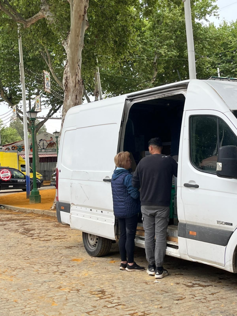 – “Tenemos que traer toda la maquinaria, los muebles, y por supuesto montar la cocina. El tema de montaje es un sueldo y trabajar en la feria es otro. Cuando acabemos con los preparativos y empiece la feria, trabajaré de cocinera en la caseta, y una vez que acabe esta feria nos vamos a otra porque porque tras la de Sevilla, empieza un recorrido por las ferias de otras ciudades y pueblos que dura unos 6 meses. Y cuando terminemos con las ferias nos dedicamos a otra cosa, ya que mi jefe tiene otra empresa que nos lo permite.”