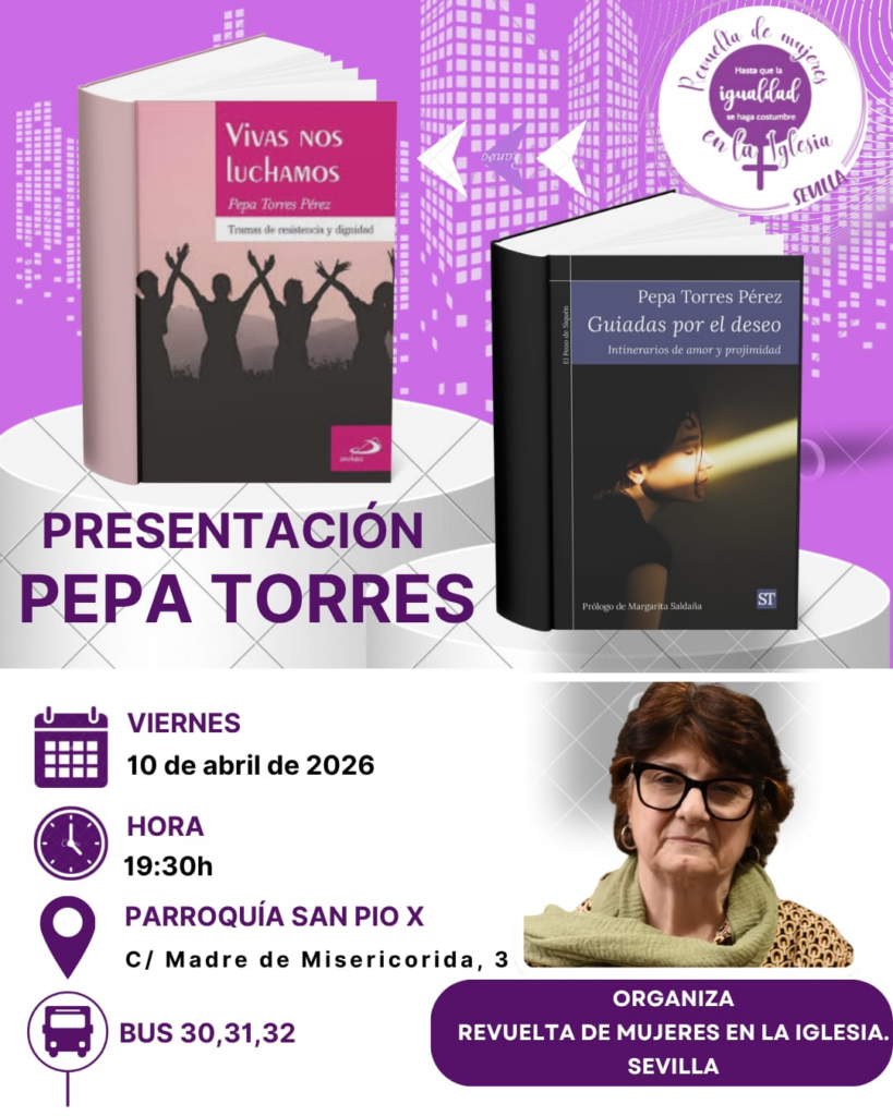 Hoy se han presentado en la Parroquia San Pío X , ubicada en el Polígono Sur de Sevilla, los libros de Pepa Torres Pérez, «Vivas nos luchamos» y «Guiadas por el deseo». La presentación de la autora ha corrido a cargo de Mercedes López Herrera, ambas miembros del movimiento «Revuelta de las mujeres en la iglesia». Pepa Torres, religiosa que vive y trabaja en el barrio de Lavapiés, en Madrid, defiende en sus obras la inclusión real de la mujer en la institución, principal reivindicación de la «Revuelta».