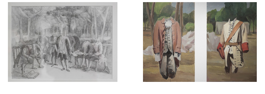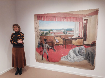 “A partir de esta obra, que da título a la exposición, se despliegan en la sala otras piezas de menor formato, realizadas sobre papel o cartón, que funcionan como desarrollos o variaciones posteriores y complementan el sueño. Son personajes que podrían haber irrumpido en aquella primera escena. Entre ellos aparecen inmigrantes —unos reconocibles, otros invisibles—, soldados y uniformes. Se establece así un diálogo con el pasado que se condensa en un pequeño dibujo a lápiz de los filósofos de la Ilustración, representados sin cabeza, aquellos que imaginaron una Europa libre y justa”.