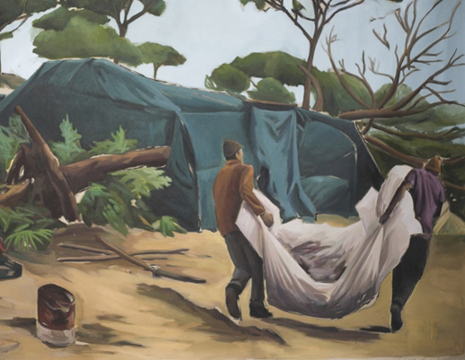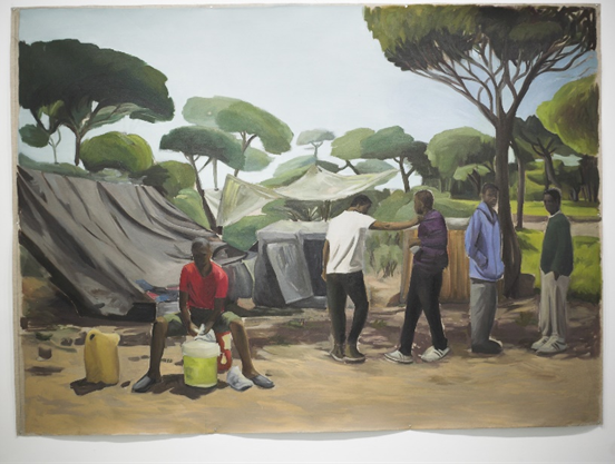 “En la primera sala que encuentra el espectador conviven dos grandes lienzos (El sueño inacabado, escena 2ª y 3ª) y tres cartones que muestran distintas secuencias de asentamientos de inmigrantes en la provincia de Huelva. Desde hace algunos años trabajo como profesora en Moguer, Punta Umbría y Aljaraque, lo que me ha permitido un contacto directo con hijos de inmigrantes. De ahí nace mi vínculo tanto con el paisaje como con la realidad precaria en la que viven muchas de estas personas. La exposición recoge las condiciones en las que se asientan estos poblados: sus construcciones improvisadas, sus espacios domésticos y sus gestos cotidianos”.