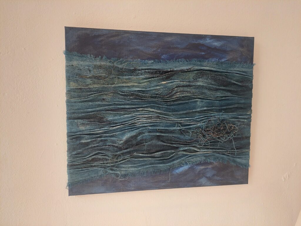 AR: -«Yo, he mencionado a mi madre, no a la artista. Pero ella cosía y lo textil aquí está muy presente, yo he trabajado con ella y parece que pudiera estar la artista, pero la referencia a mi madre tiene que ver con un duelo personal. Es el punto de partida, pero ha pasado tiempo y de hecho la obra más relacionada con el duelo, está expuesta en una colectiva en Barcelona. Aquí hay obras que se derivan o se desvían de ella, hacen referencia a la deriva del mar, pero se desvían en la medida en que pasan a ser menos estáticas, hay mucho más dinamismo, movimiento».