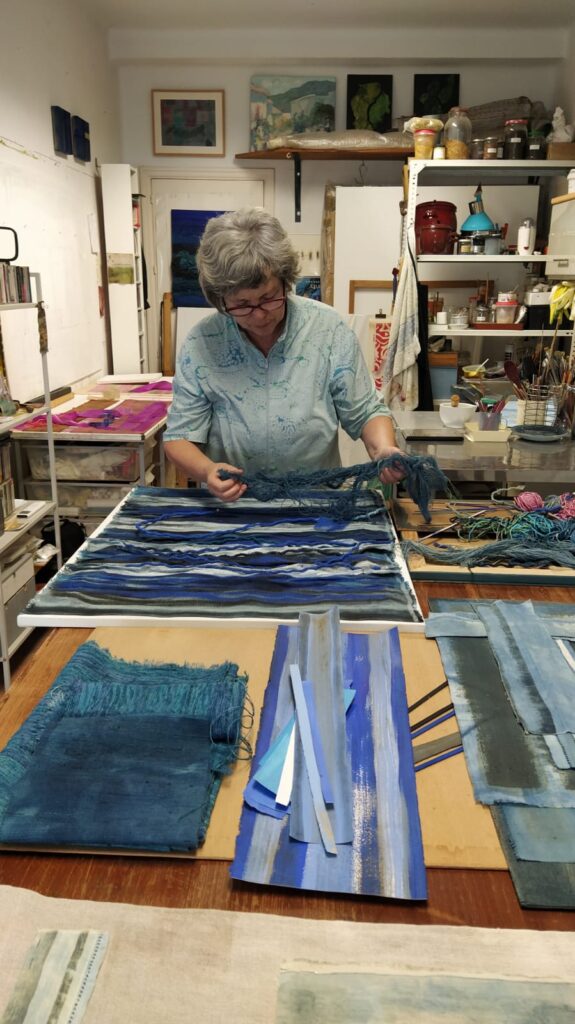 AR: -«En el año 1982. Empezaba a tener un poco de trayectoria, me presentaba a concursos de pintura, ya empezaba a teñir telas, empezaba a unir la pintura con el textil. Supuso una gran ruptura para mí. En esos momentos nos trasladamos a vivir al campo, yo era madre de un niño y me dediqué al campo. Volví a la biología, experimenté con la agricultura ecológica. Abandoné durante 20 años mi actividad artística, aunque nunca dejé de pintar del todo. Luego mi hermana Chonin, con la que soy coautora dellibro” El hilo que nos une”, que recoge nuestra trayectoria y que obtuvo ayuda de la Fundación María Fulmen, me habló de unos talleres en Madrid sobre tintes y estampación. Aprendí las técnicas. Vivía en el campo, disponía de espacio y empecé a practicar. La práctica es fundamental.Poco a poco retomé mi actividad artística.«