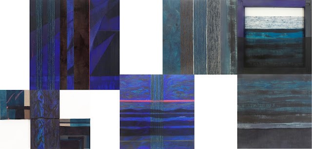 AR. –«Es un planteamiento personal. El desencadenante es el fallecimiento de mi madre. Me surge entonces, la necesidad de tocar sus telas, de tenerla conmigo un poquito más. Parto de telas heredadas de ella, de algunos hilos y me planteo el azul como color. Antes, ya había trabajado otros colores, los rojos, amarillos, verdes,pero el azul lo había tocado poco. Necesitaba seguir experimentando y el azul me iba bien para el duelo, el azul cielo, el azul del mar o un azul más profundo y solemne, como nos dice Kandinsky, que nos habla de la simbología en el arte de los colores. Yo me planteé trabajar con los azules, los morados y los negros. Fueron los dos puntos de partida. Empecé a teñir telas a estampar, pintar papeles etc. Empecé con los Collages y con los pliegues, que, aunque ya los había usado antes, ahora se vuelven más intensos. La pintura se abre un hueco, quiere hacerse notar de nuevo. Realizo composiciones más tranquilas, en los que entran a formar parte la pintura, las telas, los hilos Sigo manteniendo la forma de manipular siempre pegando, pero dedicado a mi madre, empecé a coser a utilizar el hilo y la aguja para unir las telas.»
