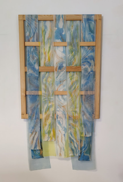 Otras dos obras de esta exposición que destacaría, son muy singulares, tienen el mismo título: “Horizonte y morada”. Una de ellas es más una interpretación tipo collage, pegando el papel y el textil y la otra es una obra donde el soporte, el bastidor es un elemento más en la composición. Son dos interpretaciones muy diferentes.