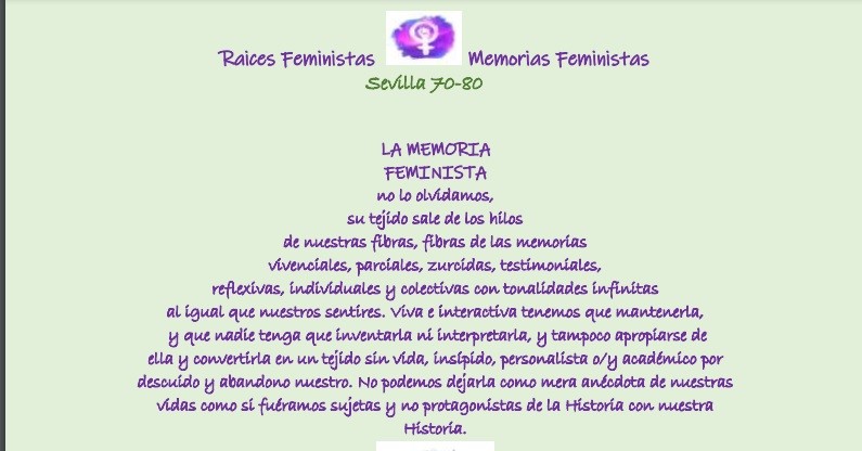 RAÍCES FEMINISTAS MEMORIAS FEMINISTAS Por Mireya Forel Sevilla 70-80LA MEMORIA FEMINISTA no lo olvidamos, su tejido sale de los hilos de nuestras fibras, fibras de las memorias vivenciales, parciales, zurcidas, testimoniales, reflexivas, individuales y colectivas con tonalidades infinitas al igual que nuestros sentires. Viva e interactiva tenemos que mantenerla, y que nadie tenga que inventarla…